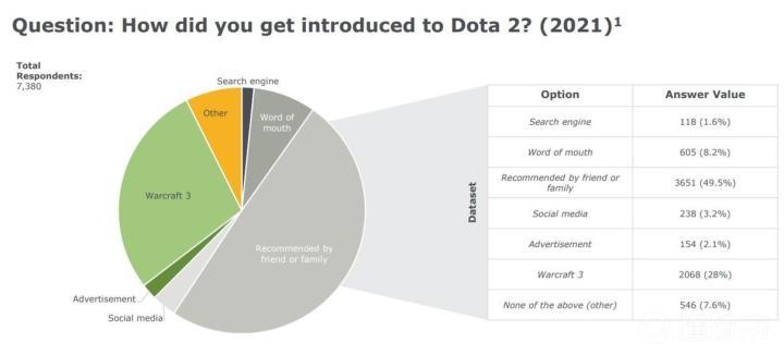 首先是进入DOTA世界的契机。28%的玩家是魔兽3时代走过来的老兵,而半数玩家是被朋友安利入坑。除此之外,还有部分玩家通过广告、社交媒体、玩家间的口口相传或者是其他方式接触到这款游戏。