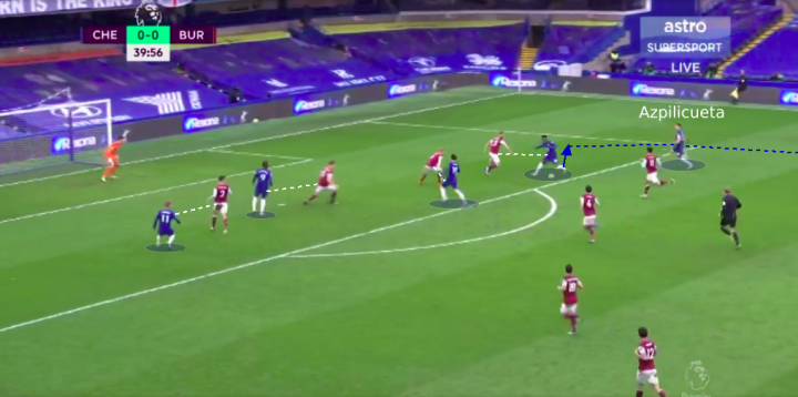 阿斯皮利奎塔也可以利用自己后插上进入对方罚球区参与进攻。实际上他在图赫尔治下打入的首个进球也是这种方式。在对阵伯恩利的比赛中,这位巴斯克后卫在下半场开始后不久便打入了一球。