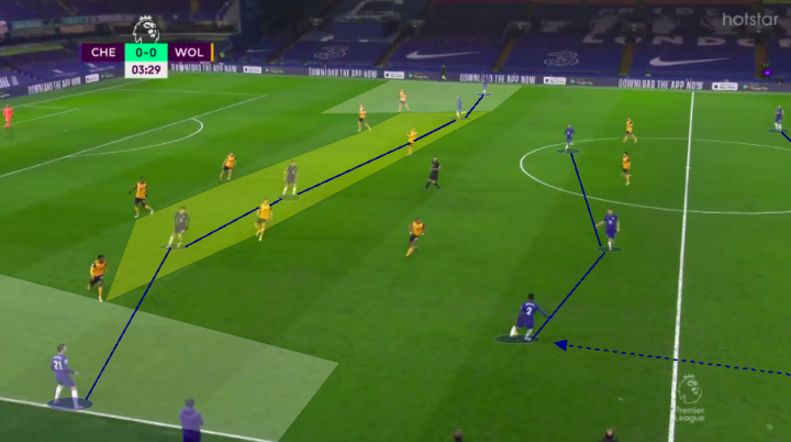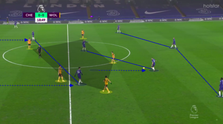 前场的三箭头会站在对方两条线之间的位置,更趋向于在中路位置活跃,为两边位置前提的边翼卫拉开空间。在这场对阵狼队的战术体系中,图赫尔使用吉鲁作为纯粹的单中锋,但收效甚微。