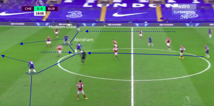 所以伪9号是个不错的解决方式。这也是图赫尔在执教球队的第二场比赛中给予亚布拉罕的职责。在球场上,亚布拉罕常常会回撤接应传球,而两个边路攻击手则会同时插上。