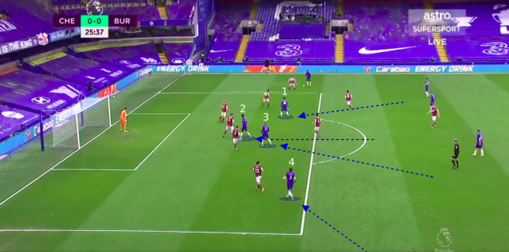 在对阵伯恩利的比赛中,图赫尔在中场休息期间对球队战术进行了一定程度的调整,因此我们看到下半场比赛中蓝军的阵型调整为了3412。在对阵热刺的比赛中,我们也看到了这一战术,不过随后德国人又将阵型改了回去。不过3412战术体系仍然不失为一个很可行的选择,下面让我们简要地看看图赫尔是如何布置这套战术体系的球员跑位的。