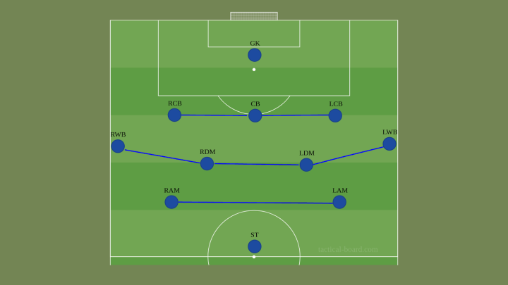 在3421体系中,蓝军会在防守时将阵型回收为5221,两名边后卫撤至防线的位置,而两名进攻型中场则从锋线位置回撤,只留下一名前锋在最前方。