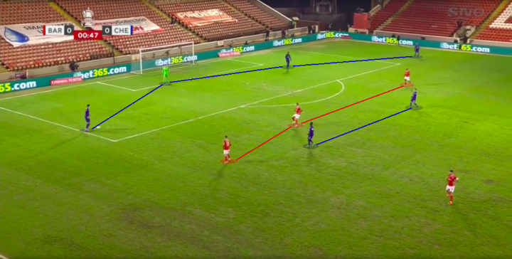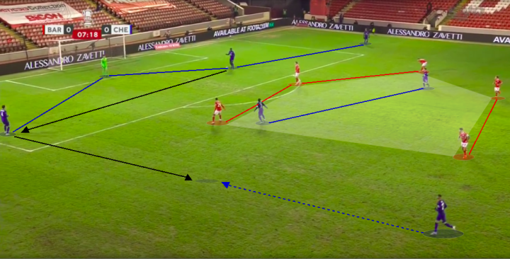 切尔西两个边后卫的位置经常前提,因此球队进攻组织的发起通常由三名中卫和两名后腰配合发起的。在自己的防守三区里,门将也会参与到战术中。在进攻组织阶段,门将通常也扮演着很关键的角色,比如说在这场对阵巴恩斯利的比赛中,凯帕就有多达80次触球。