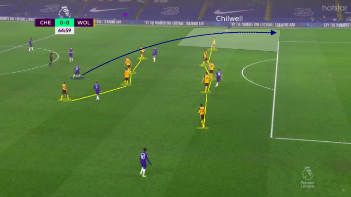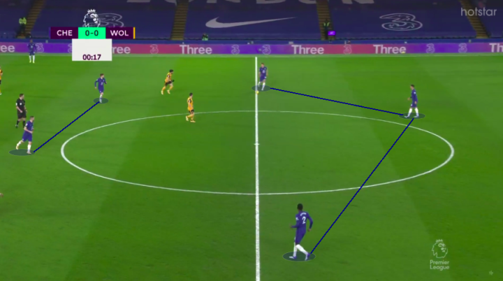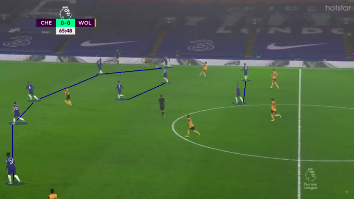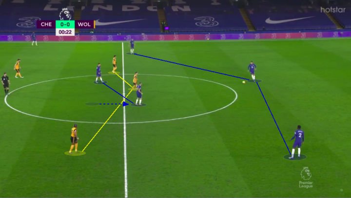 上图是图赫尔上任后首场对阵狼队的比赛,科瓦契奇是大幅回撤进行接应的那个球员,不过在这场比赛结束后,他绝大多数时间都会出现在更靠前的位置。