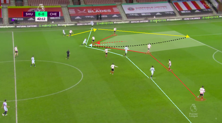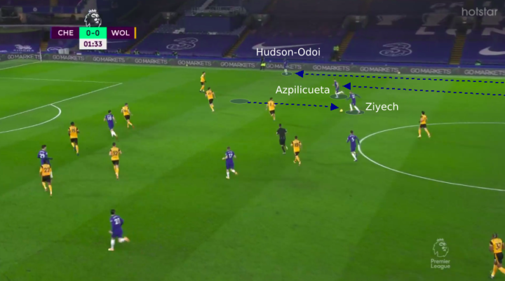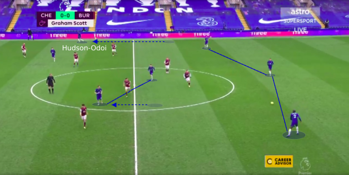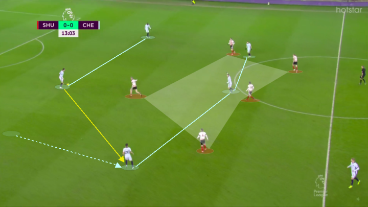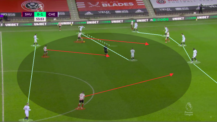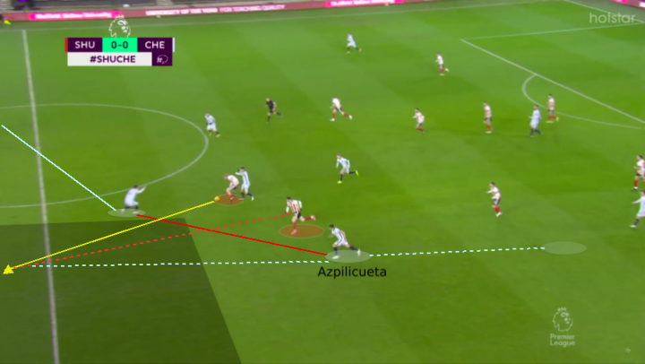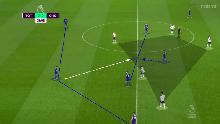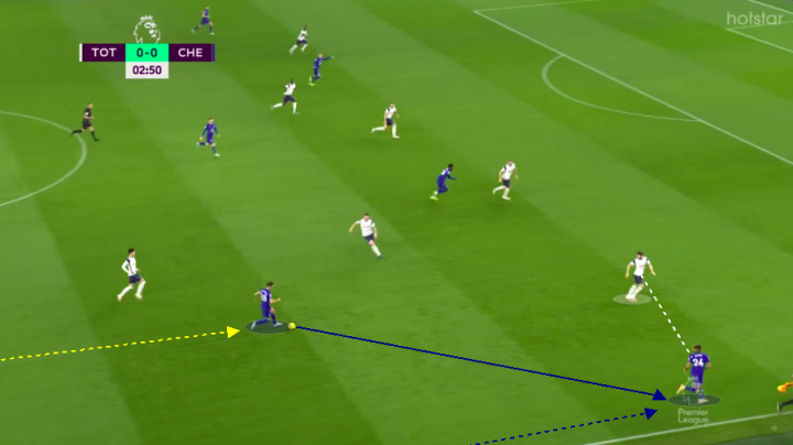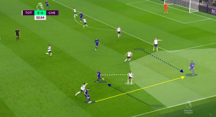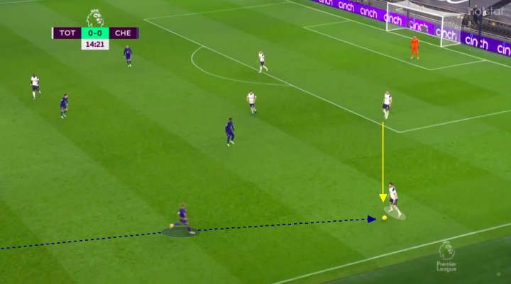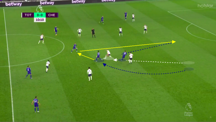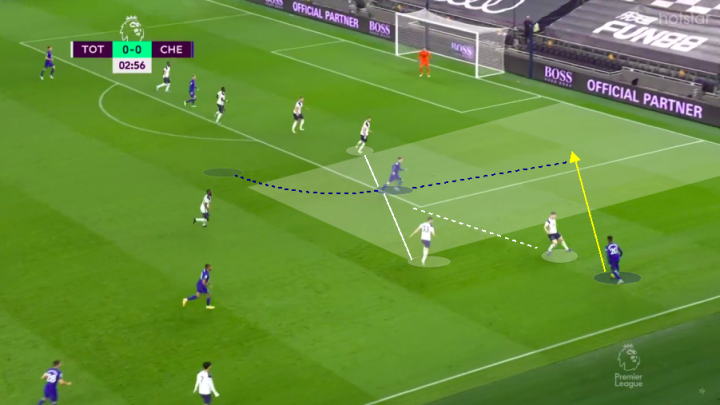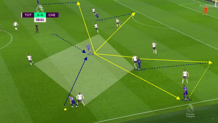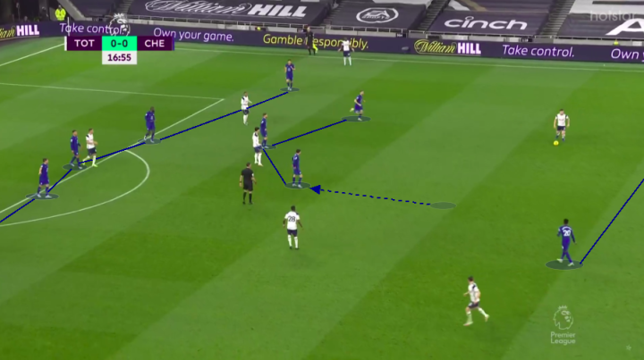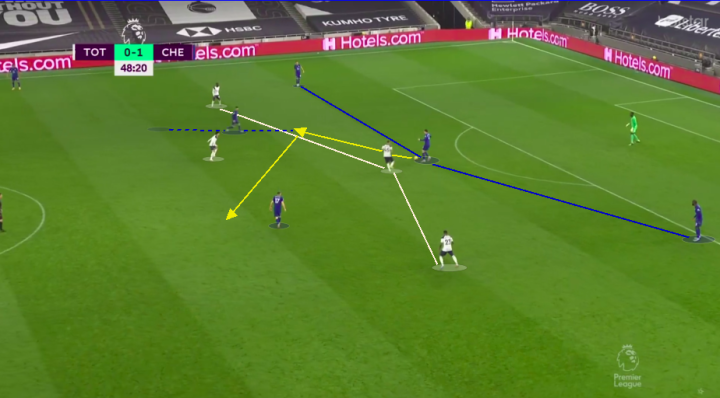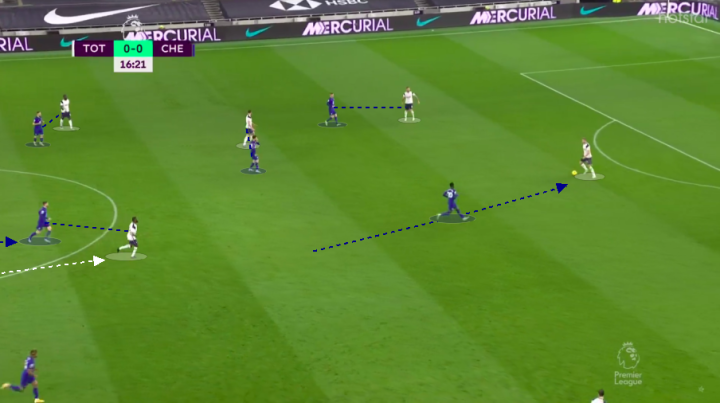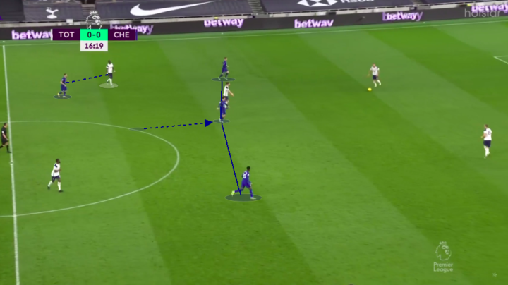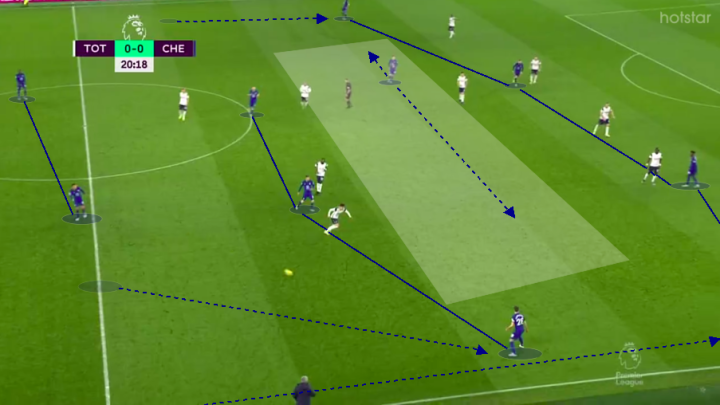 热刺的左中卫戴尔是一名右脚球员,他的传球令奥多伊跟上对接应球员进行防守及压迫。维尔纳则负责限制传向另一名热刺中卫的传球路线,芒特则站在对方的后腰身前。在他们身后,蓝军的两名后腰也各自以人盯人防守的方式限制着对方球员。