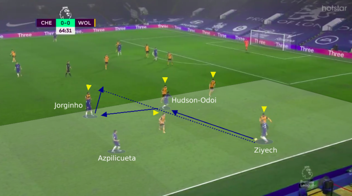 在将球彻底发展出本方罚球区附近区域后,切尔西的门将就不会继续参与进攻组织了,球队会以3-2结构继续发展进攻。他们倾向于使用若日尼奥和科瓦契奇作为中场组合,其中前者常常大幅后撤来帮助推进进攻,而克罗地亚人更多时候则会将位置前提,为身后的队友提供一个撕破对手压迫防线的出球点。