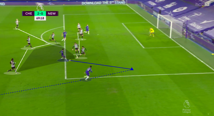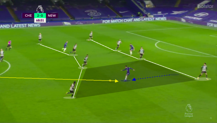 在面对纽卡的比赛中,蓝军也是利用前场的3名球员进行压迫。在他们的身后,则是由两名中场球员以及一名边翼卫所组成的第二道防线,而参与防守的这名边翼卫要取决于对方发起进攻的边路是哪一边。