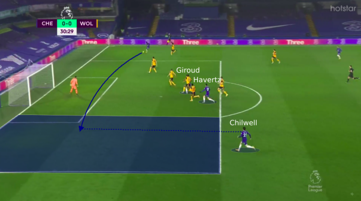 这场比赛中,切尔西有40%的进攻来自于右路,左路则为29%,因此球队也就有了很多传中——准确讲是36次。不过在对方罚球区内针对传中进行抢点的球员只有哈弗茨和吉鲁这两位球员,这是因为齐耶赫如前文所述的情况会大幅度回撤。左边翼卫奇尔韦尔也会作为远端的一个后插上的进攻点尝试抢点,但是由于冲刺距离等问题,他的到位率并不高,无法作为固定的抢点球员。