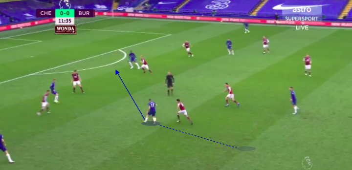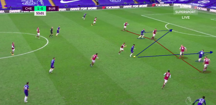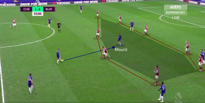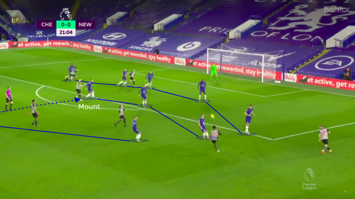 当蓝军在右路组织进攻时,芒特通常会从对方防线的位置回撤,找到一个有着不错空间的位置接应。他会在控球半转身后直面对方的防线,随后通常会将球直塞给伺机而动、正在后插上的右边翼卫。