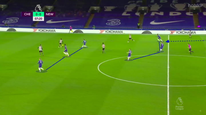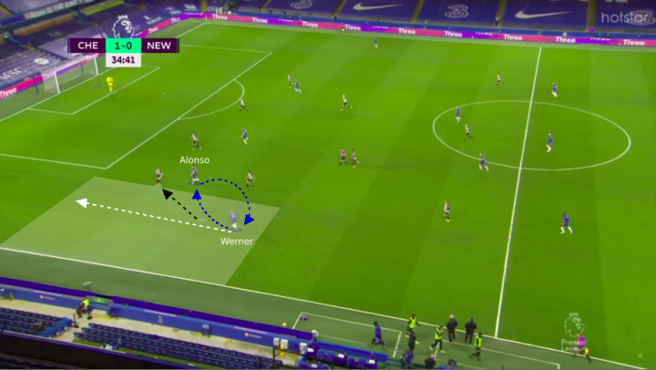 在面对纽卡的比赛中,我们看到了左路的攻击型中场和边翼卫彼此换位,阿隆索的跑位吸引了原本盯防维尔纳的对方右边后卫,从而为德国人创造了进攻空间。上图的例子便是蓝军在比赛中打入首球前的实例。