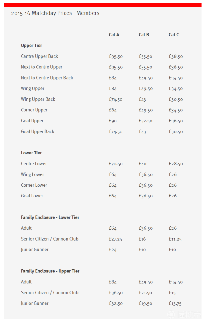 附图2:2015/16赛季阿森纳俱乐部主场会员票价 图片来源:【Arsenal.com】