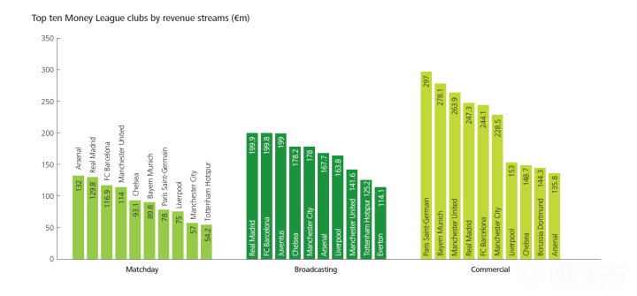 开篇图:欧洲足球俱乐部比赛日收入、转播收入、商业收入的分别排名前十(单位:百万欧元),图片来源:【德勤《足球金钱联赛》2016年】