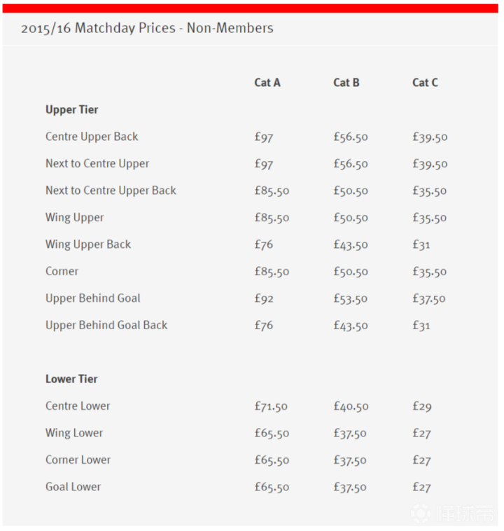 另外,俱乐部还区分出了会员和非会员市场价格(附图3),单场比赛最高票价97镑就出自此处。但事实上,俱乐部的售票机制层层递进,保证了各组不同优先购买权的球迷利益之后,再面向公开发售。通常只有一些极不重要的比赛,非会员才有可能享受拿到俱乐部公开发售的比赛门票。此时俱乐部可以通过没有“门槛”的优势,吸引到那些偶尔会到现场看一两场球的消费者,填补座位空缺。