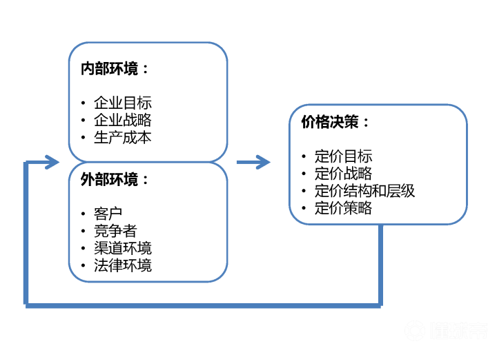 其实,“4P”元素已经为定价指出了大方向,我们可以认为“产品”是关乎企业内部的元素,涉及了企业目标、发展战略、生产成本等内容,而“渠道”更偏向于外部环境的元素,比如客户、竞争者,渠道环境、法律环境等等。