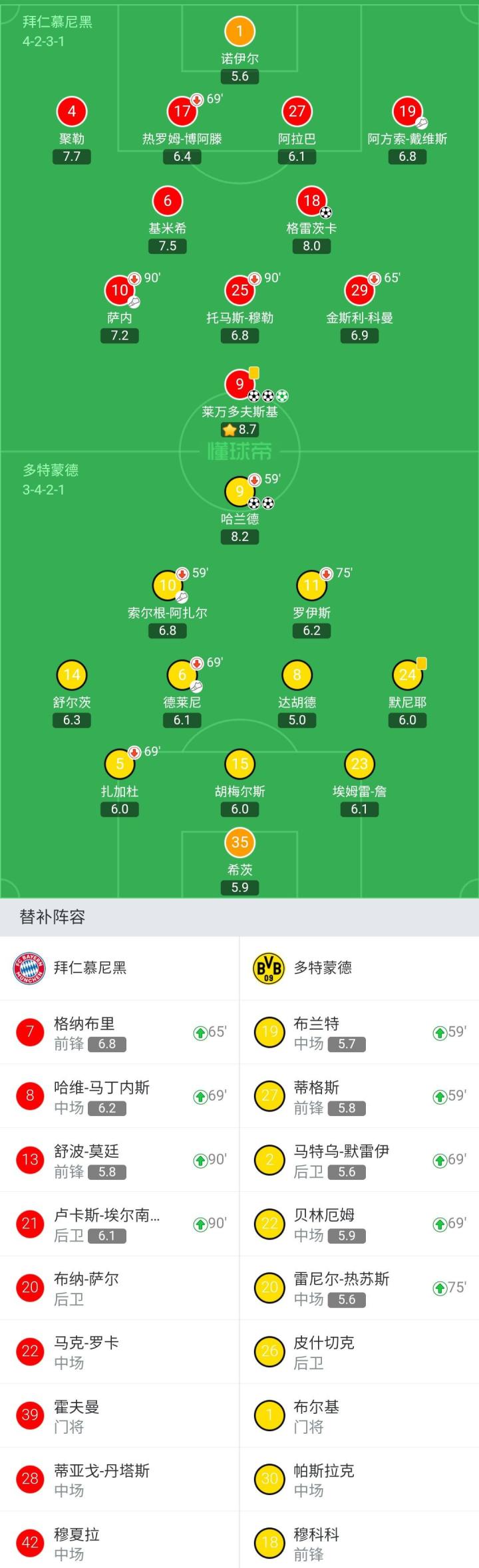 拜仁首发:1-诺伊尔、4-聚勒、17-博阿滕(70'8-哈维-马丁内斯)、27-阿拉巴、19-阿方索-戴维斯、6-基米希、18-格雷茨卡、10-萨内(91'21-卢卡斯-埃尔南德斯)、25-托马斯-穆勒(91'13-舒波-莫廷)、29-科曼(66'7-格纳布里)、9-莱万多夫斯基