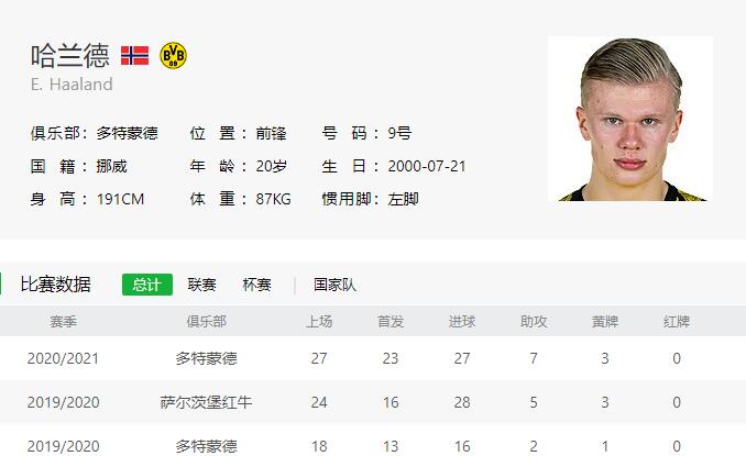 2019~2020赛季,哈兰德在萨尔斯堡红牛和多特蒙德共计出场42场比赛,取得了多达44个进球,是欧洲进球效率最高的前锋之一。