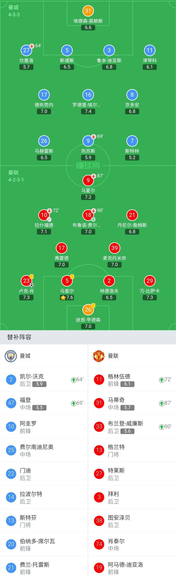 未上场替补:13-斯特芬、10-阿圭罗、14-拉波尔特、20-伯纳多-席尔瓦、21-费兰-托雷斯、22-门迪、25-费尔南迪尼奥