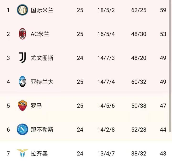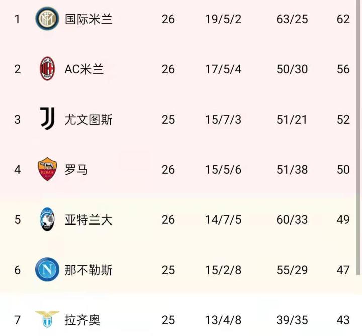 本轮过后意甲积分榜前3排名不变,罗马重返第4位。但前7分差扩大。第7的拉齐奥(少赛一轮)与榜首国米是19(之前是16)个积分的分差。积分榜3-7位扩大为9个分差。意甲新7姐妹中,北方三强,罗马,那不勒斯本轮都拿到3分,尤其是尤文和国米,在新7姐妹内战中拿下3分,更为难得。积分榜3-5位,只有3个积分差,而第6的那不勒斯与尤文也就5个分差,双方之间的补赛尤为重要。本赛季意甲联赛前4名争夺依然持续激烈态势。国米联赛7连胜,继续保持在榜首位置。