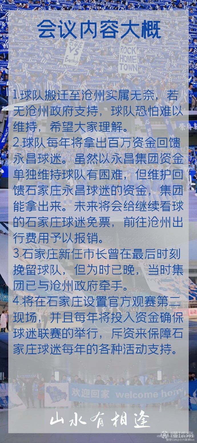 网传石家庄球迷恳谈会内容:沧州雄狮将出资百万回馈永昌球迷omega17 @懂球帝2021-03-09 14:53北京时间3月9日上午,有博主透露沧州雄狮为石家庄球迷召开了一场恳谈会,在会议中,球队承诺将拿出百万资金回馈永昌球迷。图片来源:见水印有博主透露的恳谈会内容大概中显示,沧州雄狮队每年将拿出百万资金回馈永昌球迷,未来会给继续看球的石家庄球迷免票,并报销前往沧州的出行费用。此外,球队还将在石家庄设置观赛第二现场,并会投入资金确保球迷联赛进行,斥资保障石家庄球迷每年的支持。图片来源:见水印展开更多