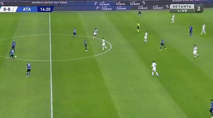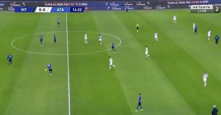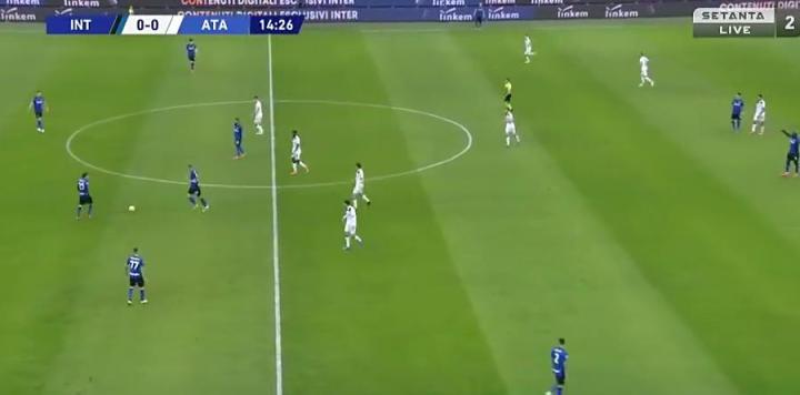 14分钟20秒时,角球进攻结束,国米阵型的详细转化过程,此时,三中卫参与角球归来,中场死亡三矮,在最后控球。当时阵型334。但三中场和三中卫,在换位的过程中。