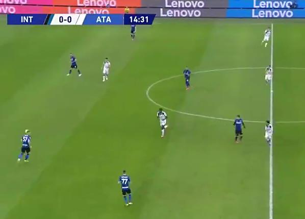 14分22秒时,食客还没回位,另2个中卫基本回位了,国米双翼位拉的很开,还在等待食客回位后,再进行进攻尝试,而不是在阵型未完全落位时冒险。