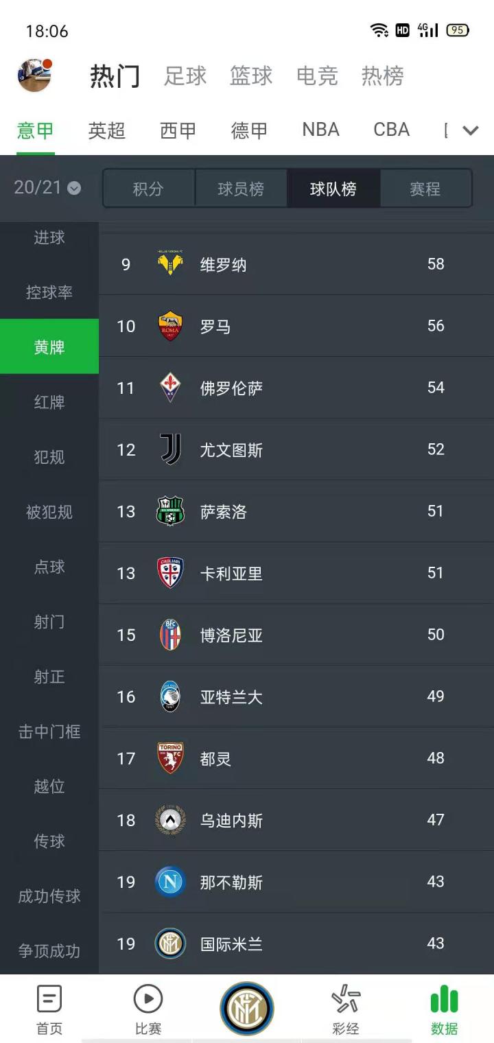 国米本赛季黄牌榜最后一名。。。