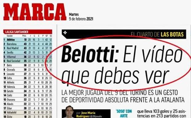 《马卡报》表示:“很少能见到一名球员倒地后第一时间示意裁判对手没有犯规的事情,在球队0-3落后的情况下更是如此。但是都灵前锋安德烈亚-贝洛蒂就是这样与众不同。”