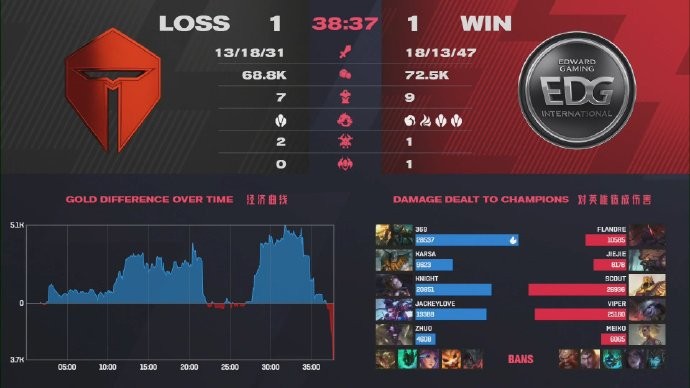 第37分钟,EDG携带双龙BUFF高地推进,小炮连续跳跃完美五杀,EDG成功翻盘TES扳平比分!