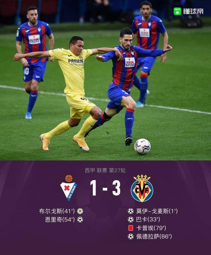 第86分钟,佩德拉萨两连击锁定胜局,比利亚雷亚尔3-1埃瓦尔结束八轮不胜!
