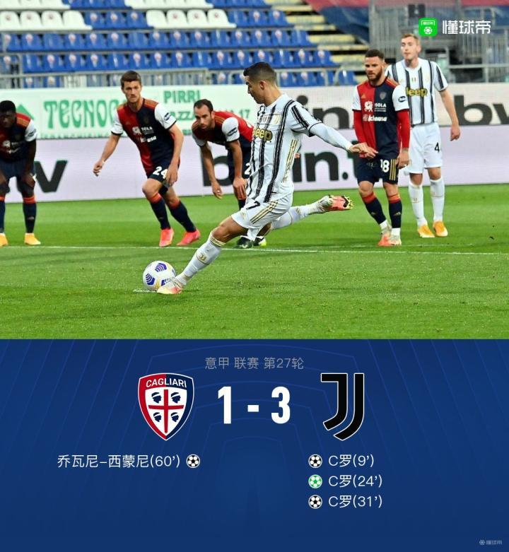 第32分钟,费德里科-基耶萨助攻,C罗上演帽子戏法,卡利亚里0-3尤文图斯!