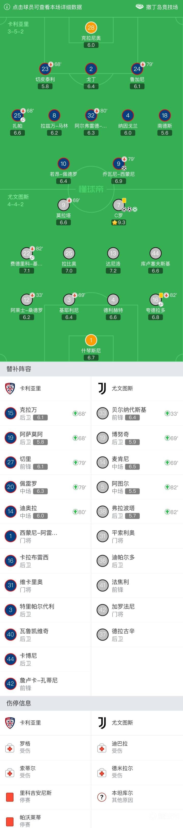 第10分钟,夸德拉多角球助攻,C罗头球破门,卡利亚里0-1尤文图斯!