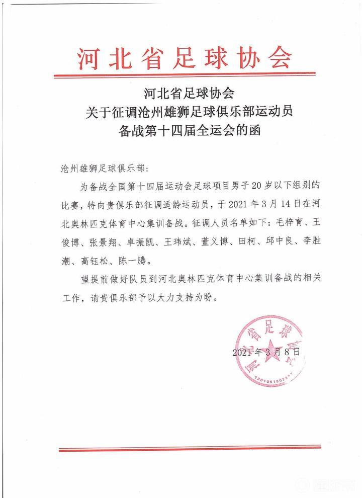 在河北足协向我俱乐部发出的征调函中,包含了毛梓育、王俊博、张景翔、卓振凯、王玮斌、董义博、田柯、邱中良、李胜潮、高钰松、陈一腾11名球员。