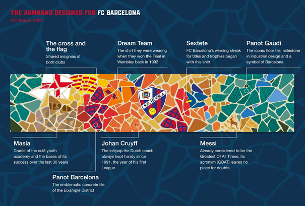 近日,在与巴萨的比赛日前,韦斯卡别出心裁地设计了富有巴萨球队及巴塞罗那城市风格的队长袖标。这支上赛季西乙冠军球队,正通过标新立异的创意形式,向对手的所在城市致敬。