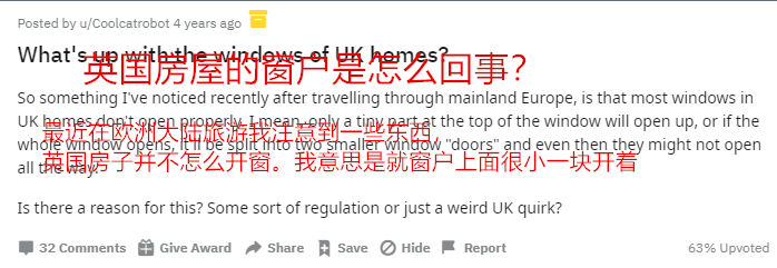 英国Reddit网友为此解答,当地的夏季并不炎热,并且考虑到外来风险,开窗并不必要。