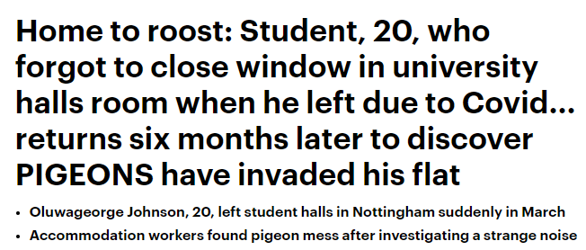 去年8月底疫情隔离结束,20岁英国大学生Oluwageorge Johnson准备从伦敦北部的家中返回诺丁汉的学生公寓。宿舍管理员提前发来邮件,以下内容让Johnson这辈子不敢忘记关窗。