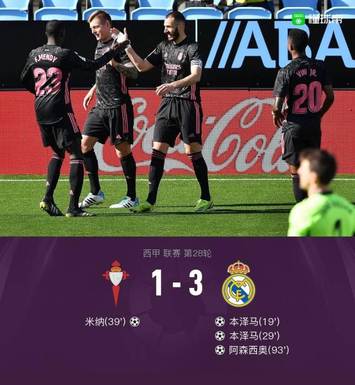北京时间3月20日23:15,西甲第28轮继续进行,皇家马德里客场挑战塞尔塔。上半场,本泽马联赛连场梅开二度,克罗斯助攻双响,米纳回头望月为塞尔塔扳回一城。下半场,阿斯帕斯任意球攻门击中立柱,读秒阶段本泽马助攻阿森西奥锁定胜局。最终,皇马客场3-1击败塞尔塔。
