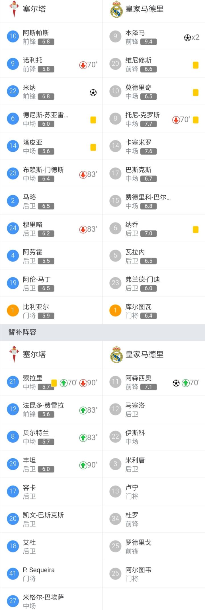 塞尔塔首发:1-比利亚尔、19-阿伦-马丁、24-穆里略(83`12-法昆多-费雷拉)、4-阿劳霍、2-马略、14-塔皮亚、6-德尼斯-苏亚雷斯、9-诺利托(70`21-索拉里)(90+1`29-丰坦)、23-布赖斯-门德斯(83`8-贝尔特兰)、22-米纳、10-阿斯帕斯