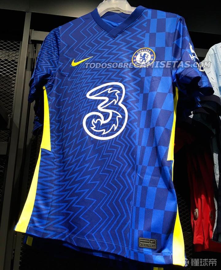 知名球衣网站footy headlines公开了2021-22赛季切尔西主场球衣曝光,球衣仍然使用了传统皇家蓝色,但配以锯齿条纹和棋盘格的图案混搭,还搭配了少许荧光黄色。