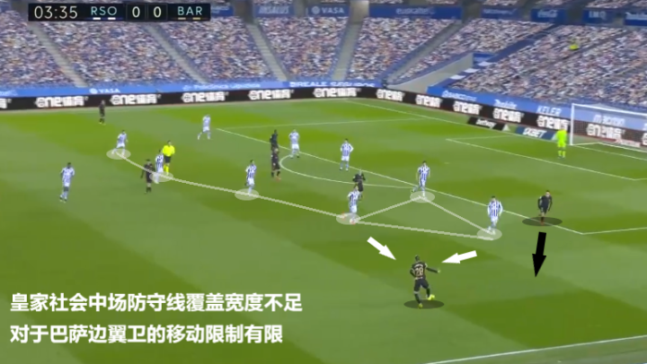 然而对于巴萨相对活跃的两个边翼卫来说,皇家社会的中场线整体的覆盖是不足的。他们在更多时候是把两条边路放给了巴萨,自己则主要防守住大禁区的宽度,以期限制巴萨正面的进攻。往往要等巴萨把皇家社会的两条线压缩成一条线的时候,阿尔巴和德斯特才会在靠近边线的位置受到一定压力。