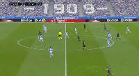 皇家社会的两名后卫球员之间出现了一个比较大的缝隙,登贝莱就利用这个空间向前走。梅西的传球撕开了后防线,这一次进攻可以说是将登贝莱的优势发挥得淋漓尽致。直塞的提前量控制在最合理的范围内,登贝莱的跑动让皇家社会球员甚至找不到犯规的机会。在防守队员准备贴身的瞬间,这一次登贝莱打远角的射门十分有力。只不过裁判认为登贝莱越位在先,从回放上看,这个判罚还是值得商榷。