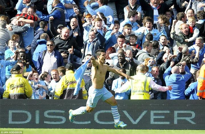 (图)2012年5月13日,凭借阿圭罗93分20秒的绝杀球,曼城捧得阔别44年之久的英格兰顶级联赛冠军