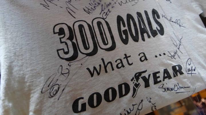 博物馆里还有一件全队签名的300球纪念T恤。1998年2月,史蒂夫·布尔在狼队2-0战胜布里斯托尔城的比赛中上演了这一里程碑。