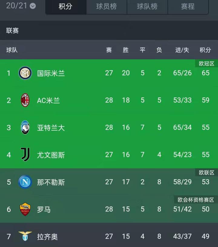 目前,意甲28轮过后,国米积65分(少赛一轮)是在意甲榜首,进球数和净胜球全联盟第一,失球数全联盟第二少。