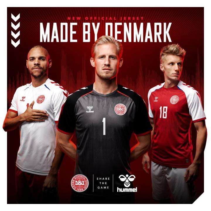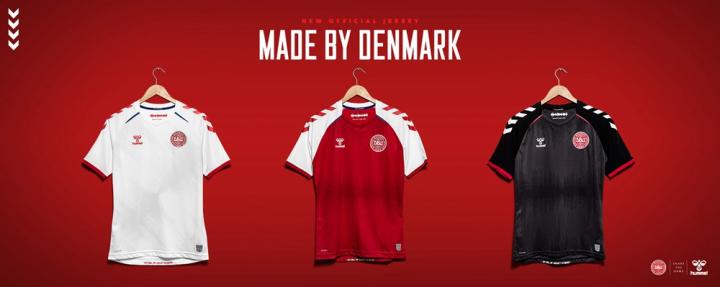 丹麦国家队全新主场仍以经典的红色形象示人,搭配白色插肩衣袖以及红、蓝两色细节。球迷高唱国歌的一部分声波图案以横纹形式出现在球衣正面与背面。客场球衣则以白色作为主色,配以红、蓝两色细节,同样源自球迷演唱国歌的声波以对角线的方式出现在球衣上。而门将球衣则以灰色为主搭配黑色插肩衣袖,球衣上同样加入截取自国歌的声波图案。