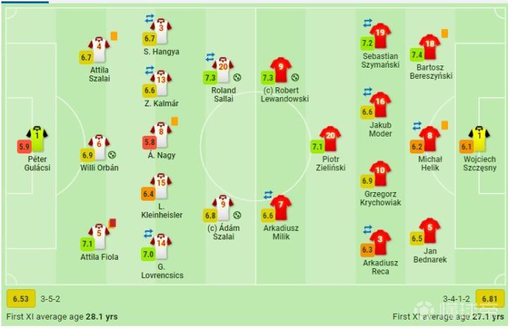 波兰首发:1-什斯琴尼、3-雷察(78`13-雷布斯)、8-海利克(57`11-格利克)、5-简-贝德纳霍克、18-巴尔托什-贝雷申斯基、20-彼得-杰林斯基、16-莫得尔(58`23-皮扬特克)、10-格里高兹-克里乔亚克、19-希曼斯基(58`21-尤伊维亚克)、7-米利克(83`4-格罗西茨基)、9-莱万多夫基斯