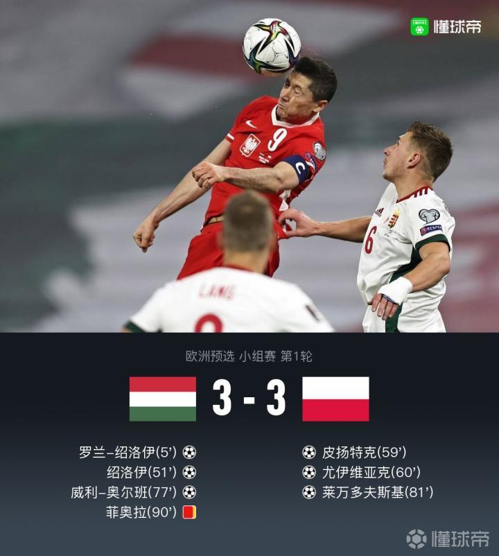 匈牙利3-3波兰,奥尔班破门,莱万救主