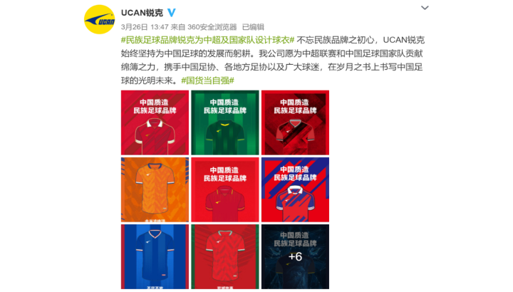尽管如此,卡尔美、锐克等品牌还是趁机向中国足球“表忠心”,顺势做一波品牌营销。这也让“苦耐克已久”的中国球迷遐想连篇,如果足协能借机把耐克换掉,岂不是正合了大家心意?