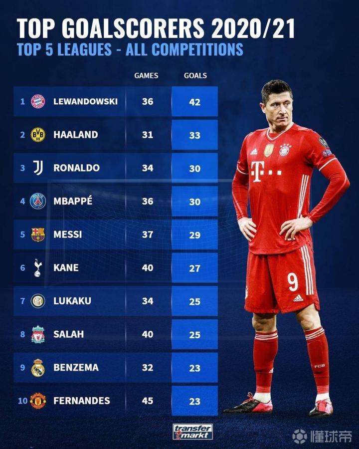 【本赛季五大联赛球员进球排行:莱万居首,哈兰德C罗紧随其后】
