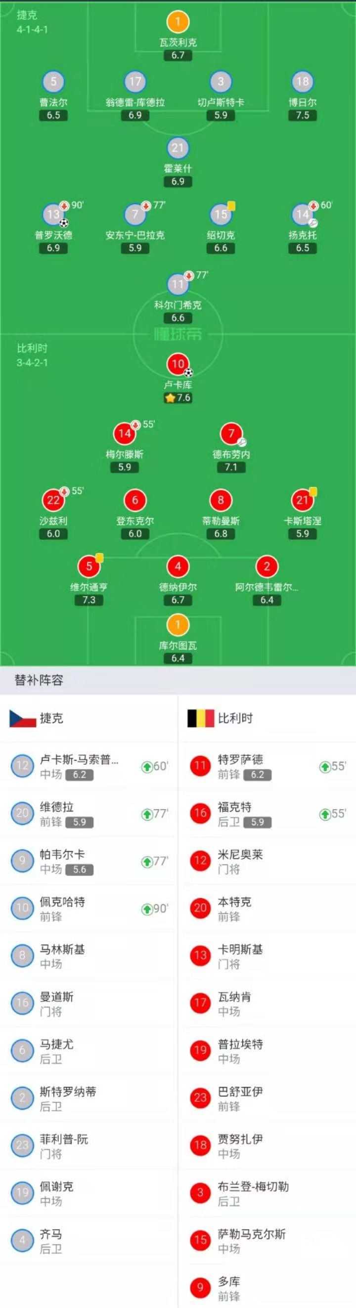 捷克首发:1-瓦茨利克、5-曹法尔、3-切卢斯特卡、17-翁德雷-库德拉、18-博日尔、21-霍莱什、13-普罗沃德(90'10-佩克哈特)、15-绍切克、7-安东宁-巴拉克(77'9-帕韦尔卡)、14-扬克托(60'12-卢卡斯-马索普斯特)、11-科尔门希克(77'20-维德拉)