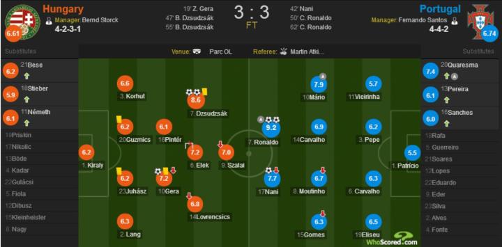 北京时间2016年6月23日凌晨0:00,欧洲杯F组第3轮的一场比赛,由匈牙利迎战葡萄牙。本场比赛,双方上演进球大战,格拉远射先开纪录,纳尼接C罗助攻扳平比分。随后,德茹扎克两度帮助匈牙利取得领先,C罗两度进球扳平比分,并且创造了连续四届欧洲杯进球的纪录。最终,葡萄牙3-3平匈牙利,以小组第三出线。
